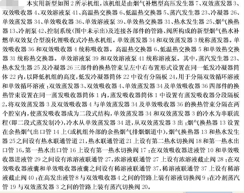 从冷却水进口管38进入机组的冷却水分三路进入机组的单效吸收器、双效吸收器和冷凝器,对机组的吸收过程和冷凝过程进行冷却降温温度升高后经冷却水出口管32出机组。从冷(热)水进口管35进入机组的冷水入单效蒸发器34换热管内,被单效蒸发器管外的冷剂水蒸发吸热降温(即蒸发制冷),再进入双效蒸发器3换热管内,被双效蒸发器管外的冷剂水蒸发吸热进一步降温后经冷(热)水出口管33出机组,使蒸发制冷过程成为二段式过程,单效蒸发器的冷水进出口温度、蒸发温度和蒸发压力均高于双效蒸发器的冷水进出口温度、蒸发温度和蒸发压力,从而使单效蒸发器一单效吸收器腔室的工作压力高于双效蒸发器一双效吸收器腔室的工作压力,使单效吸收器的稀溶液浓度得以降低(低于双效吸收器的稀溶液浓度)。降低进入热水发生器的稀溶液浓度会降低其发生温度,从而使机组能充分利用温度较低的低品位热水驱动制冷运行,将热水出口温度降到更低(可降至75℃左右),满足回水温度要求较低的燃气内燃机发电机组等外部装置的运行要求,实现节能降耗,提高能源综合利用率。