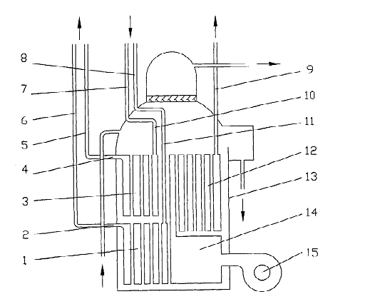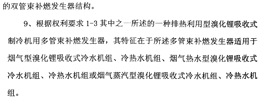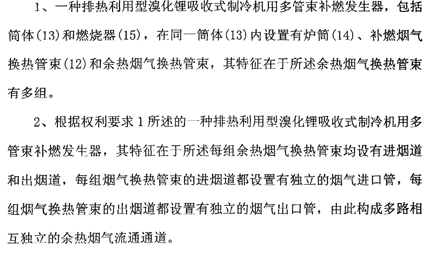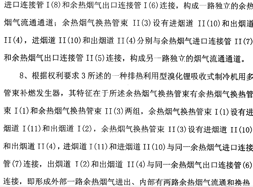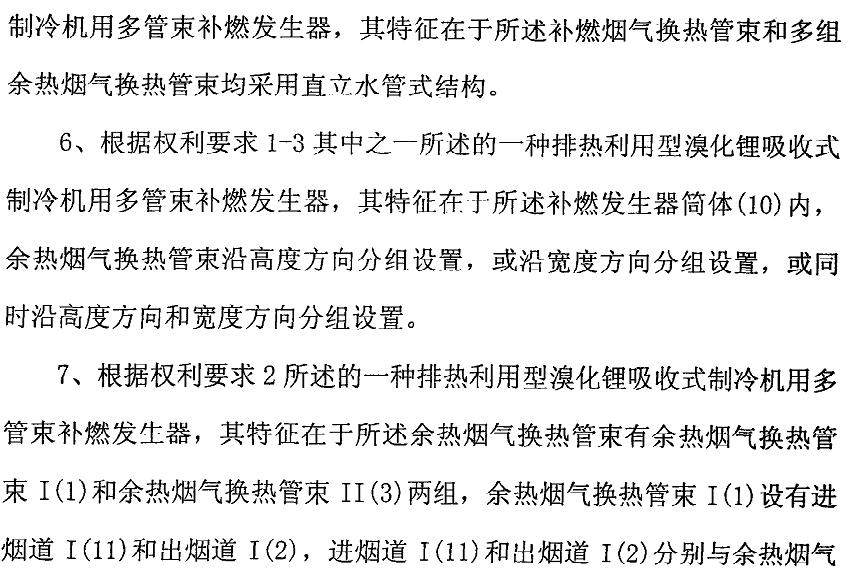 排热利用型溴化锂吸收式制冷机用多管束补燃发生器,包括筒体(13),在同一筒体(13)内设置有炉筒(14)、燃烧器(15)、补燃烟气换热管束(12)和余热烟气换热管束,其特征在于所述余热烟气换热管束有多组。 木实用新型提出的多管束补燃发生器,在同一筒体内设置有炉筒、补燃烟气换热管束和多组余热烟气换热管束,使配置该发生器的排热利用型溴化锂吸收式制冷机可与要求有独立排烟通道的多台排烟设