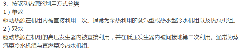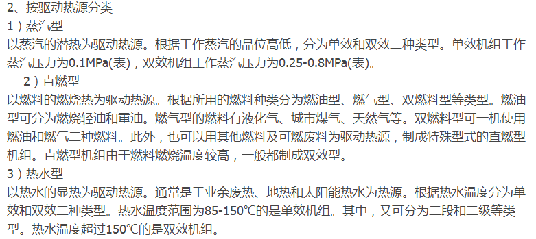 供应空调用冷水或工艺用冷却水,按照单效或双效制冷循环工作,是目前主要生产的机型。按照制冷行业标准GB/T 18431-2001《蒸汽和热水型溴化锂吸收式冷水机组》的规定,冷水出口温度分为7℃、10℃和13℃三个级别。其中7℃用于降温除湿,10℃和13℃只能用于降温冷却。