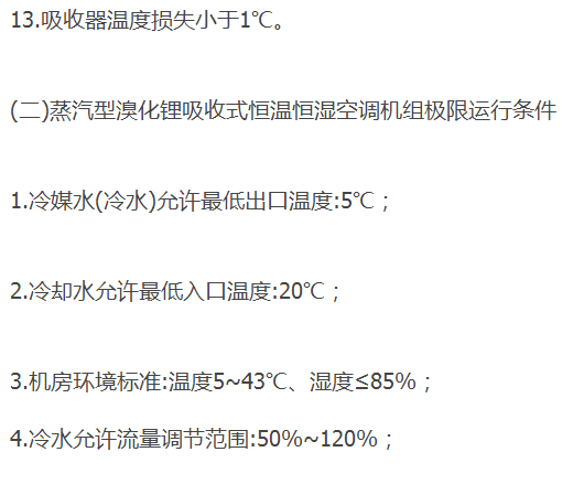 掌握溴化锂吸收式恒温恒湿空调机组(冷热水机组)正常运行的标志,使冷却水进入机组的温度(冷却水进水温度)和冷却水流出机组的温度(冷却水出水温度)分别达到机组使用说明书的要求;恒温恒湿空调机组运行条件发生变化时,能够进行运行参数调整。