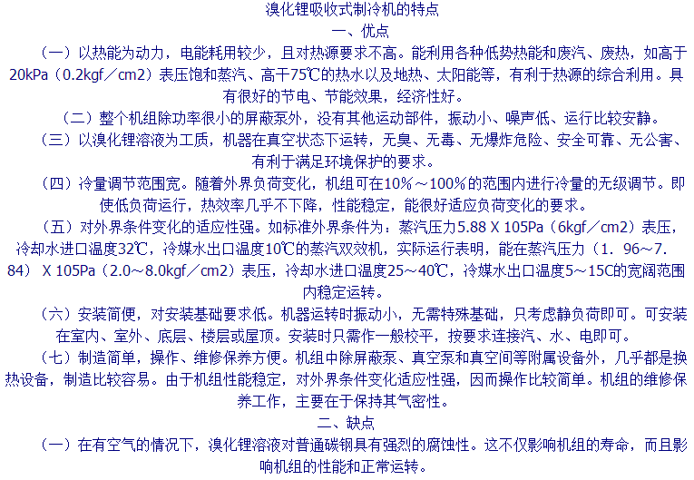 | 溴化锂吸收式制冷机的特点、工作原理及相关产品参数 | | 发布者:韩工 发布时间:2016-10-29 10:42:42 点击:2193 | 溴化锂吸收式制冷机工作原理:溴化锂吸收式制冷机是以溴化锂溶液为吸收剂,以水为制冷剂,利用水在高 真空下蒸发吸热达到制冷的目的。为使制冷过程能连续不断地进行下去,蒸发后的冷剂水蒸气被溴化锂溶液所 吸收,溶液变稀,这一过程是在吸收器中发生的,然后以热能为动力,将溶液加热使其水份分离出来,而溶液 变浓,这一过程是在发生器中进行的。发生器中得到的蒸汽在冷凝器中凝结成水,经节流后再送至蒸发器中蒸发。如此循环达到连续制冷的目的。