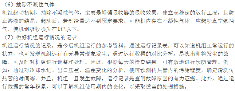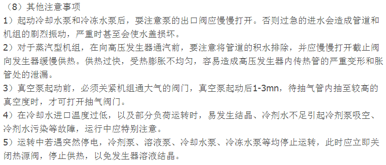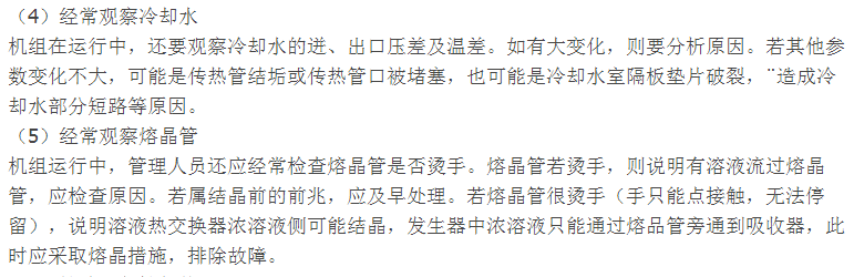 1)经常观察发生器液位。对于双效机组主要是观察高压发生器的液位。高压发生器液位过高、过低都会给机组带来不利影响,甚至损伤机组。高压发生器液位发生偏离的原因有:①溶液调节阀(特别是阀门执行机构)故障;②浮球和浮球线圈故障;③液位设定值不准确等。发现液位偏离规定值时,应立即查明原因,及时消除。