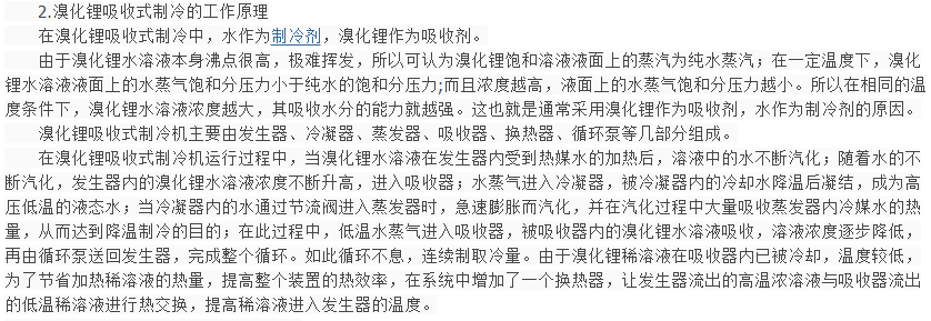 1.什么是溴化锂 溴化锂是由碱金属锂和卤族元素两种元素组成,分子式LiBr,分子量86.844,密度346kg/㎡(25℃),熔点549℃,沸点1265℃。它的一般性质跟食盐大体类似,是一种稳定的物质,在大气中不变质、不挥发、不溶解,极易溶于水,常温下是无声粒状晶体,无毒、无臭、有咸苦味。溴化锂水溶液是由溴化锂和水这两种成分组成,它的性质跟纯水很不相同。纯水的沸点只与压力有关,而溴化锂水溶液的沸点不仅与压力有关还与溶液的浓度有关。