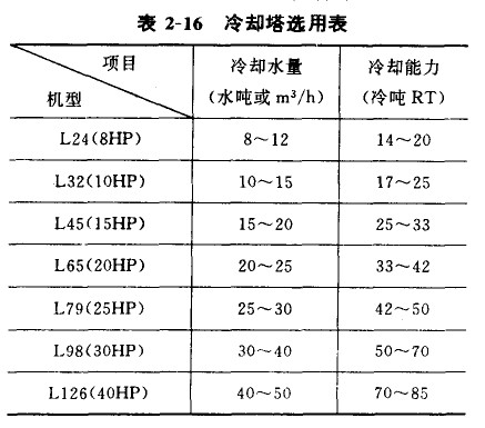 (6)选用冷却塔时应注意冷吨和水吨的不同,详细请参见表2-16。